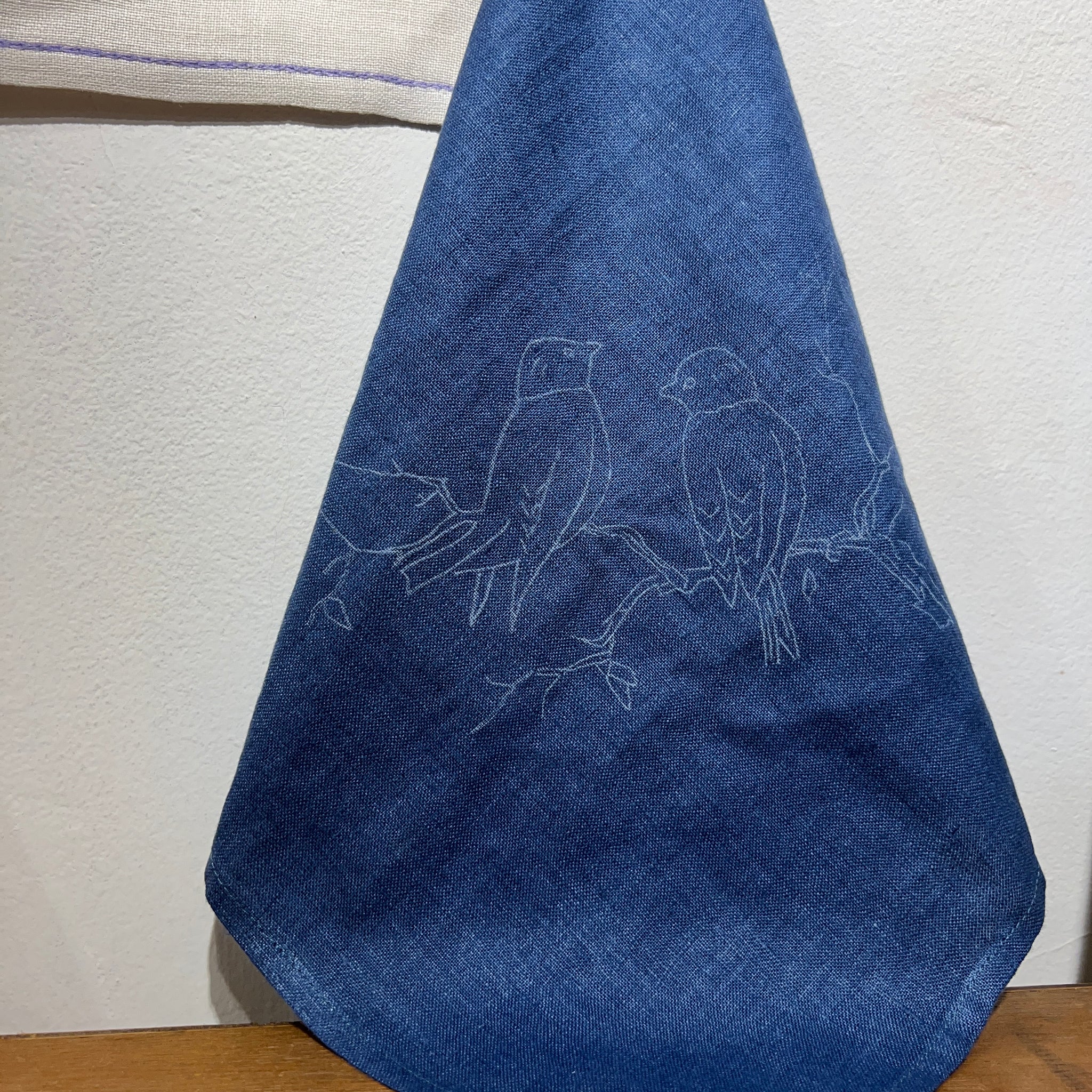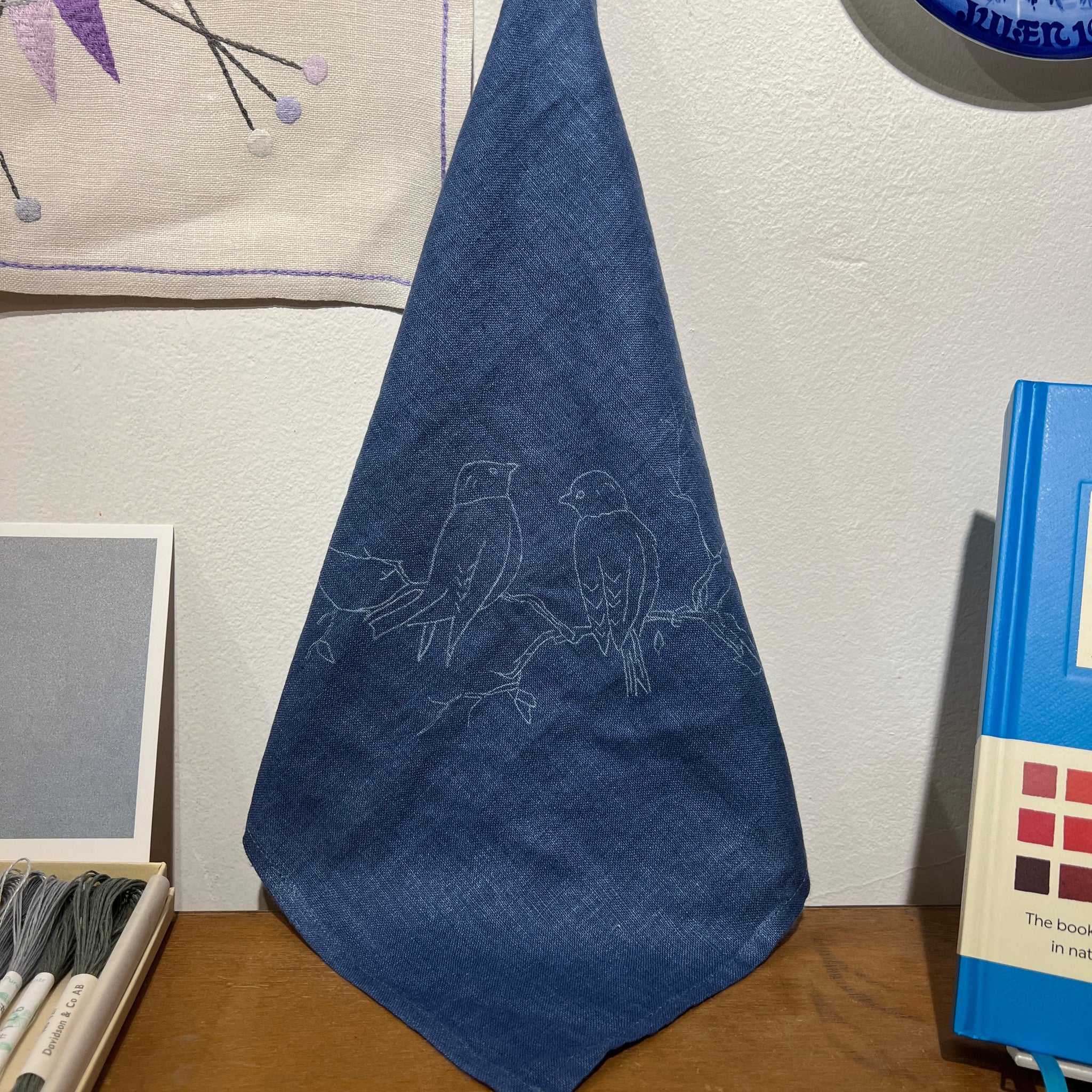 We've printed the Svartmes pattern onto the napkin and embroider the birds and twigs in white and dark blue Fine Linen.