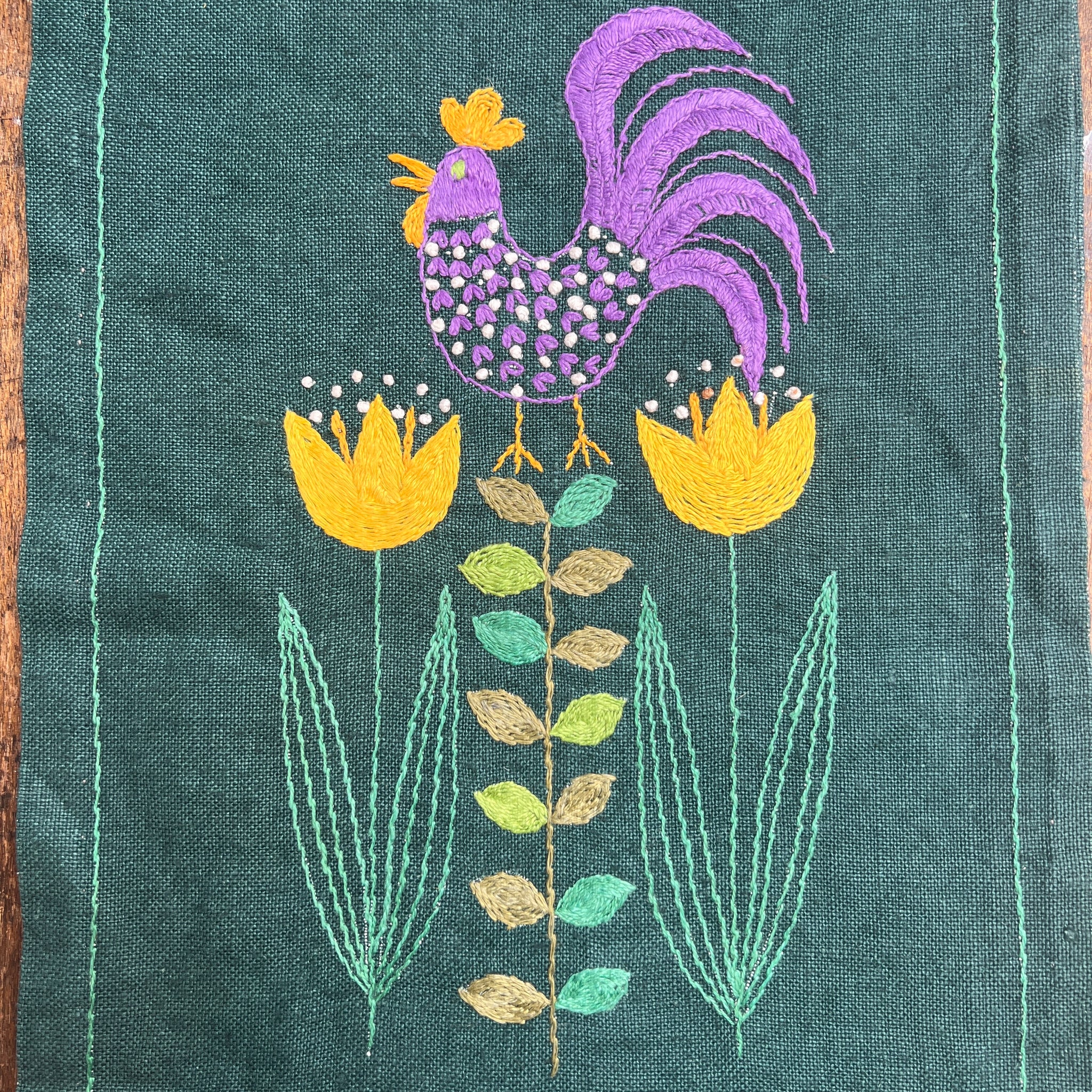 Stem stitch, chain stitch, flat or satin stitch, couching stitch, split stitch, lazy daisy, Y-stitch and French knots.
