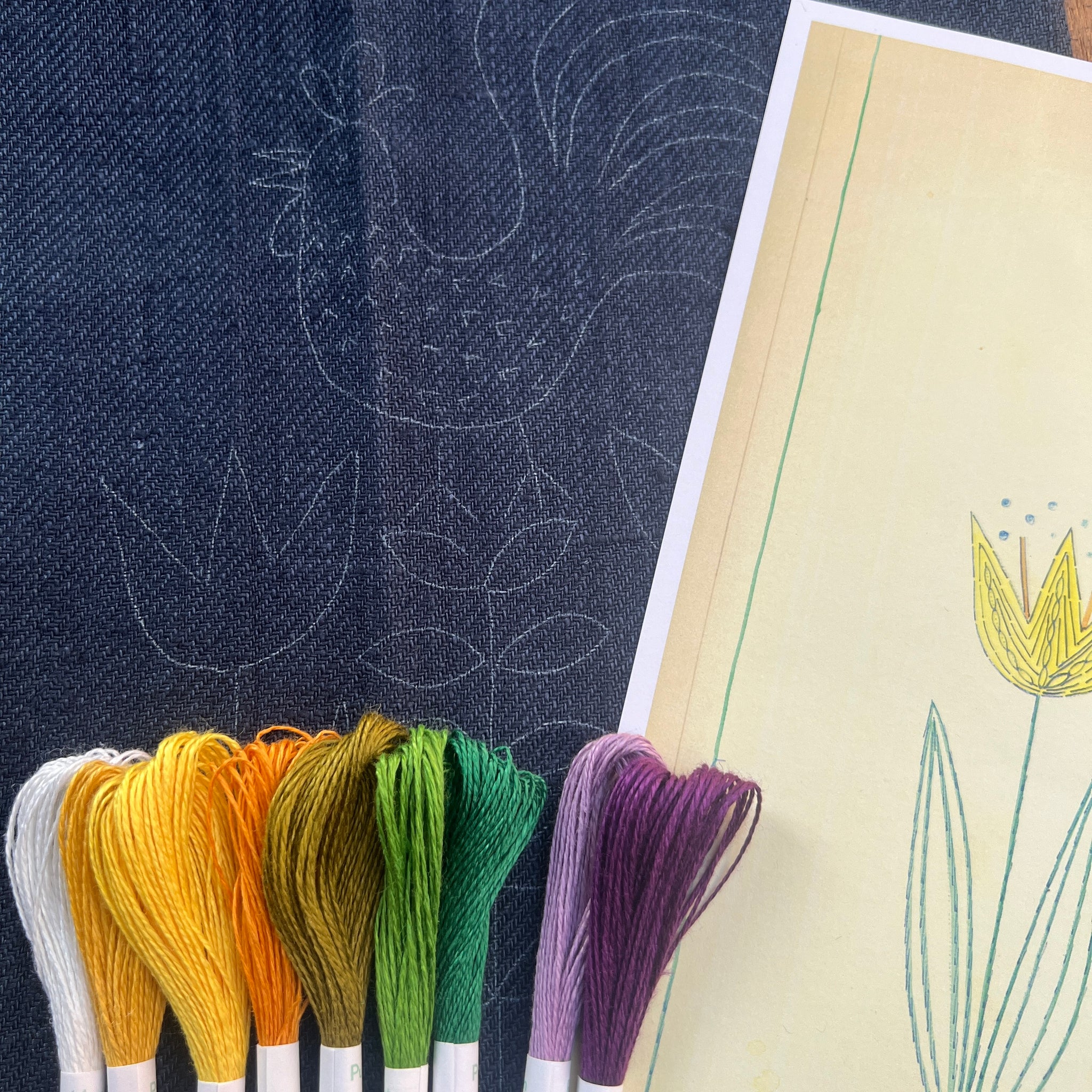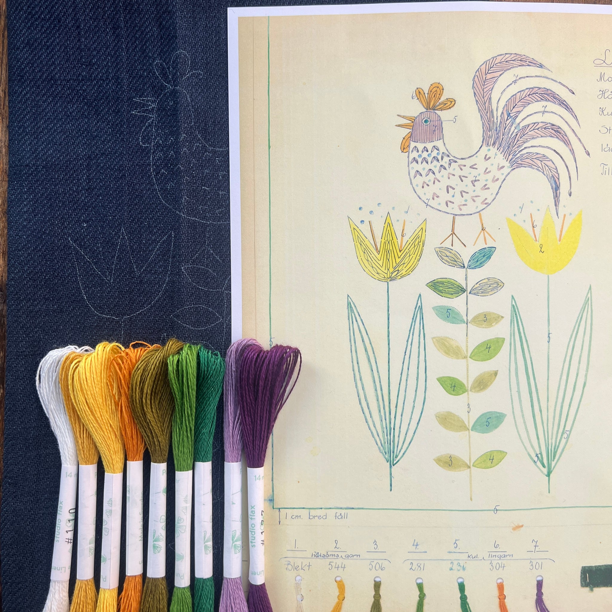 8 skeins of linen thread are included: we add an extra yellow and purple so the colours can be blended to look more like Nordiska's original.