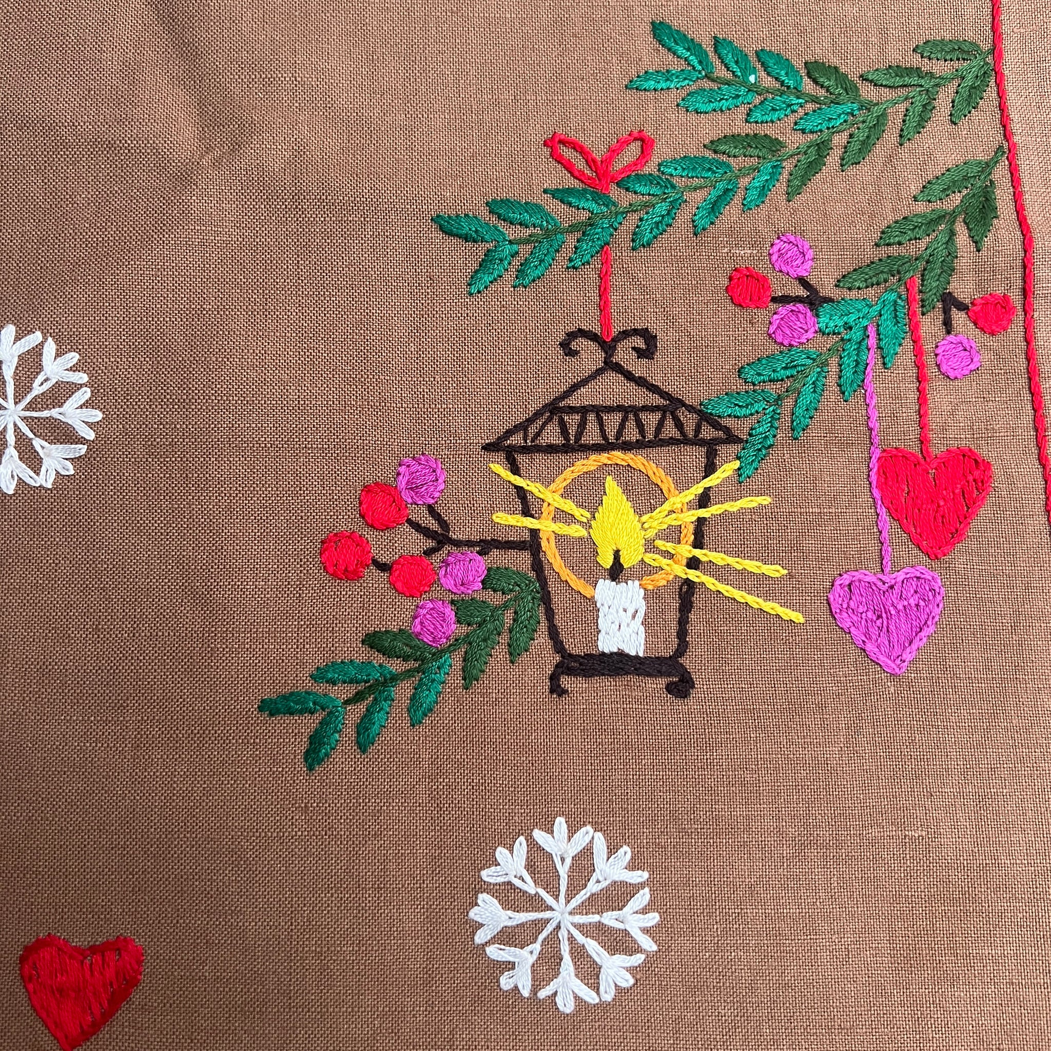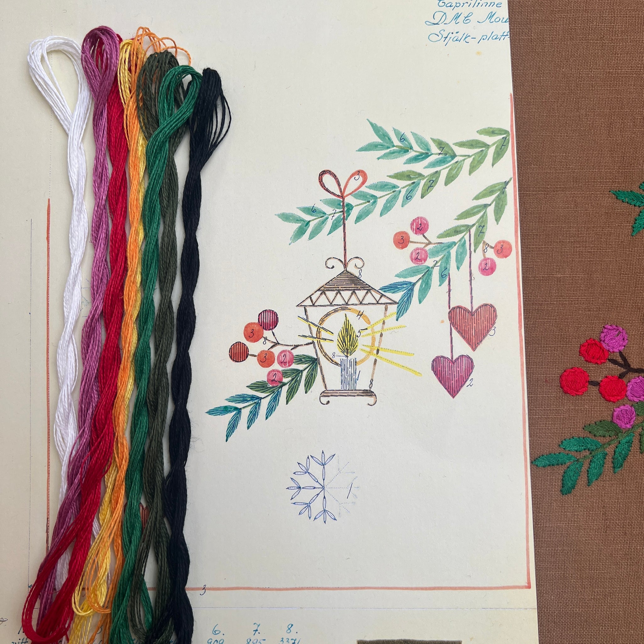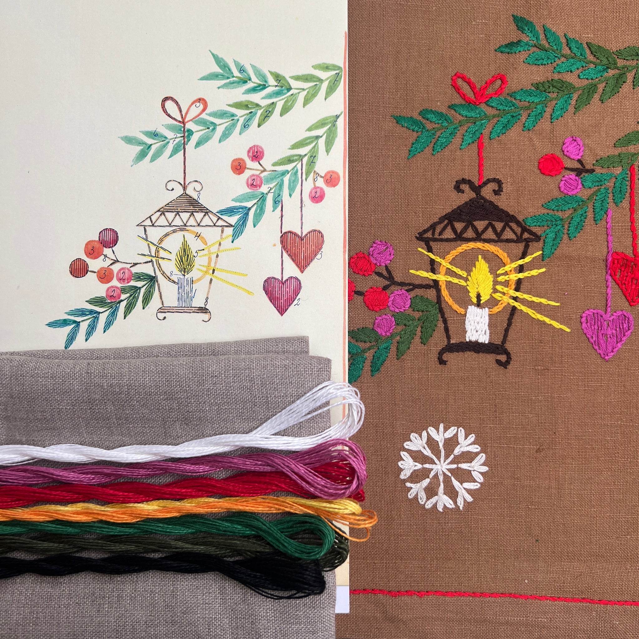 The linen measures 37 x 40 cm. This design is embroidered with linen threads in 8 colours: all included together with needle, instructions and a stitch card printed on the reverse of the pattern.
